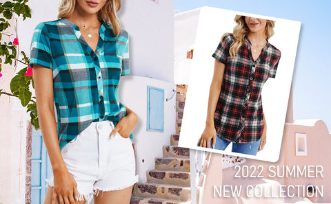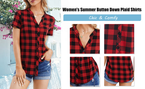 • The summer tops plaid shirt features button down closure, short sleeve, cute notch V neck, curved hem and a trendy plaid print.